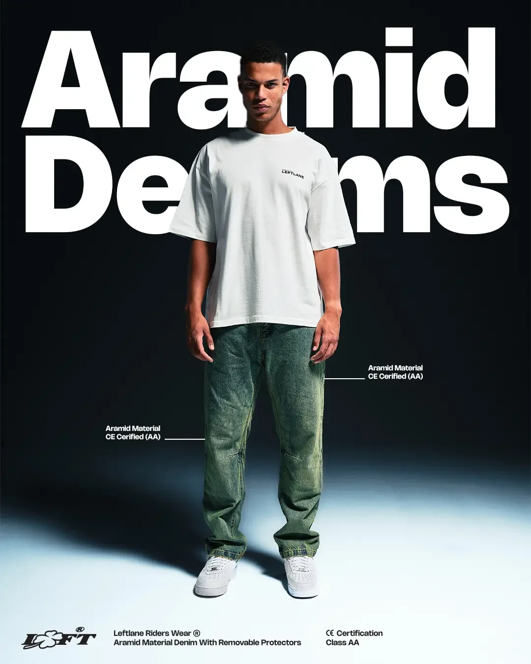 A man wearing a white t-shirt with the text 'LEFT LANE' on the chest, greenish jeans, and white sneakers, standing in front of a backdrop that reads 'Aramid Dreams' with labels indicating the trousers are made of Aramid material and CE certified.
