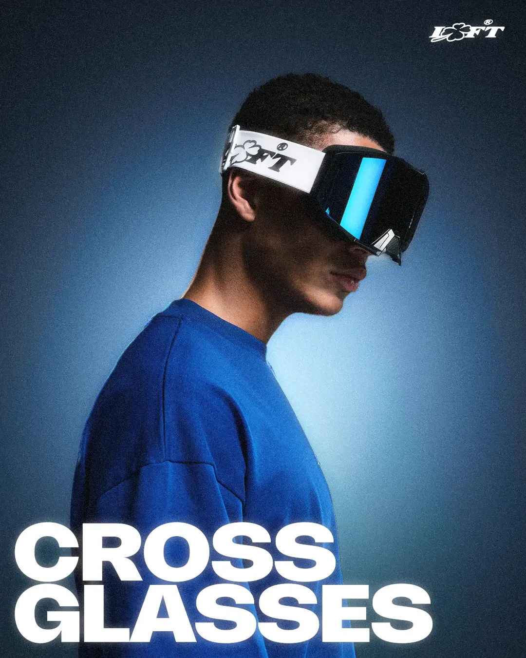 A young man wearing a blue shirt and futuristic cross-eyed glasses with a ship logo on the head strap, looking down against a gradient background.