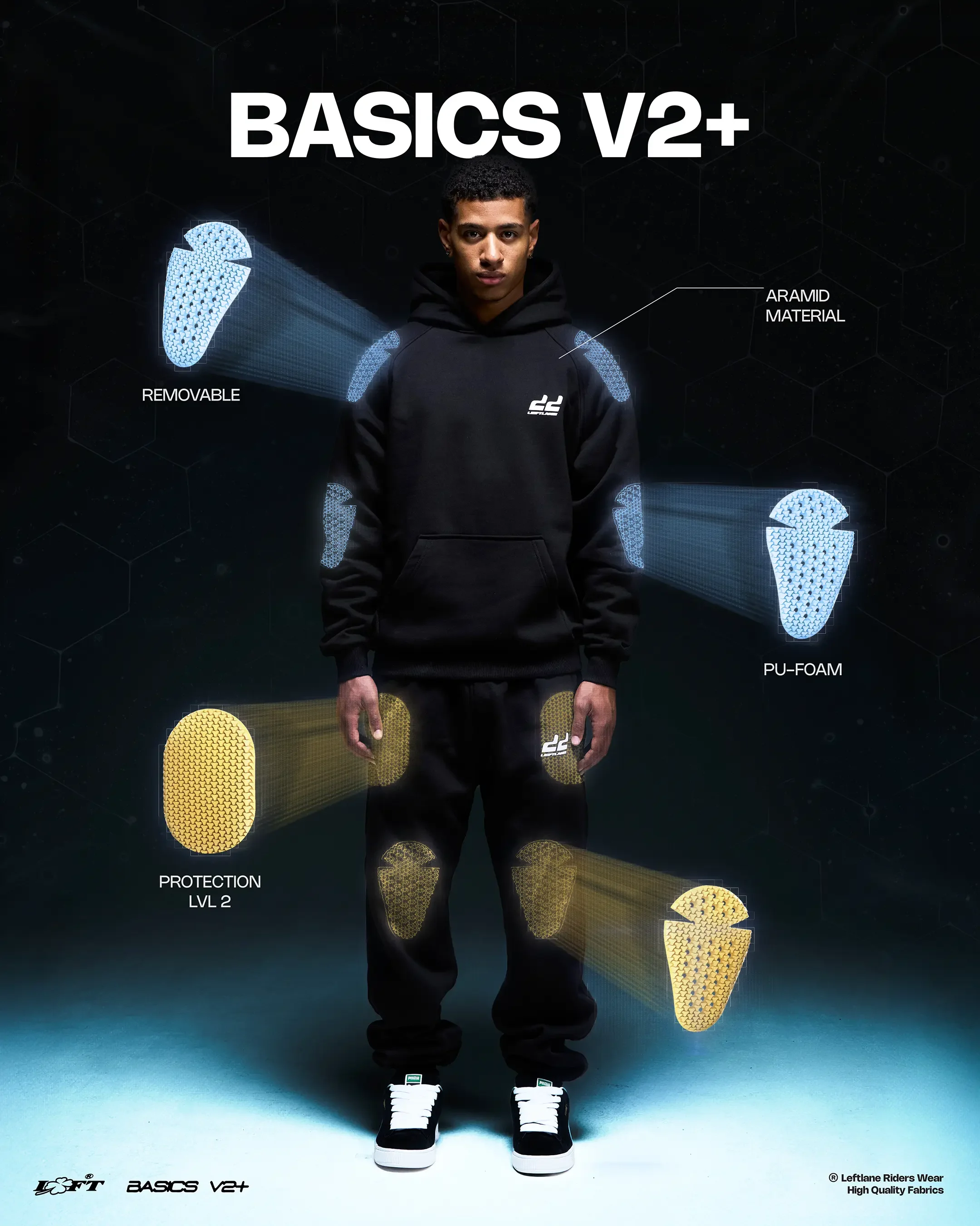 Person in black hoodie and sweatpants leaning on a white motorcycle, with labels indicating removable protectors and aramid material, and brand logos LOFT, BASICS, V2T at the bottom. View fullsize