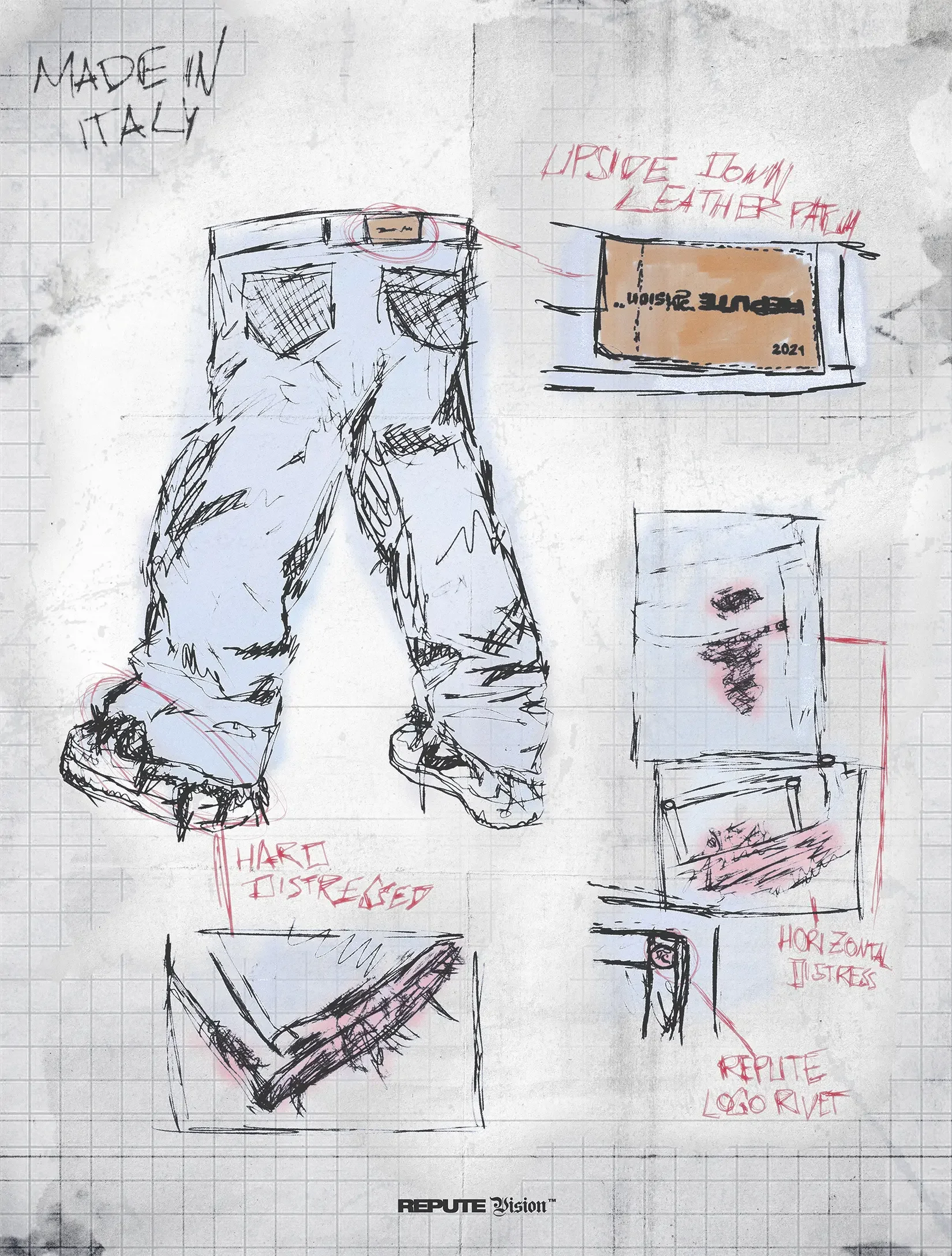 Sketch of a pair of pants with notes about materials and design details, such as 'Made in Italy,' 'Harte Distressed,' 'Upside Down Leather Patch,' and 'Horizontal Distress,' on grid paper.