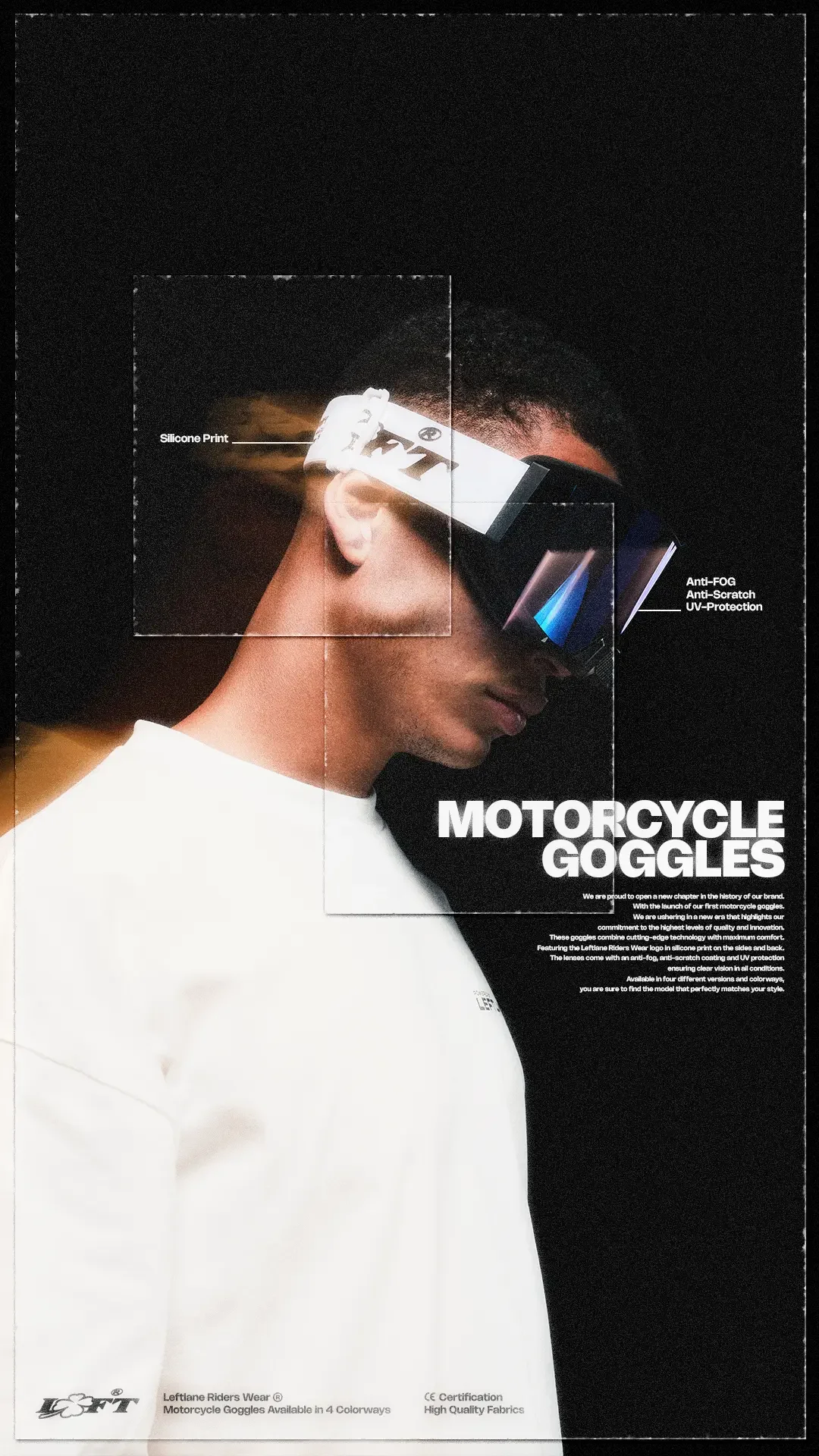 A person wearing black motorcycle goggles with blue lenses, a white shirt, and a white headband, against a black background, advertising motorcycle goggles with features including silicone print, anti-fog, anti-scratch, and UV protection. View fullsize