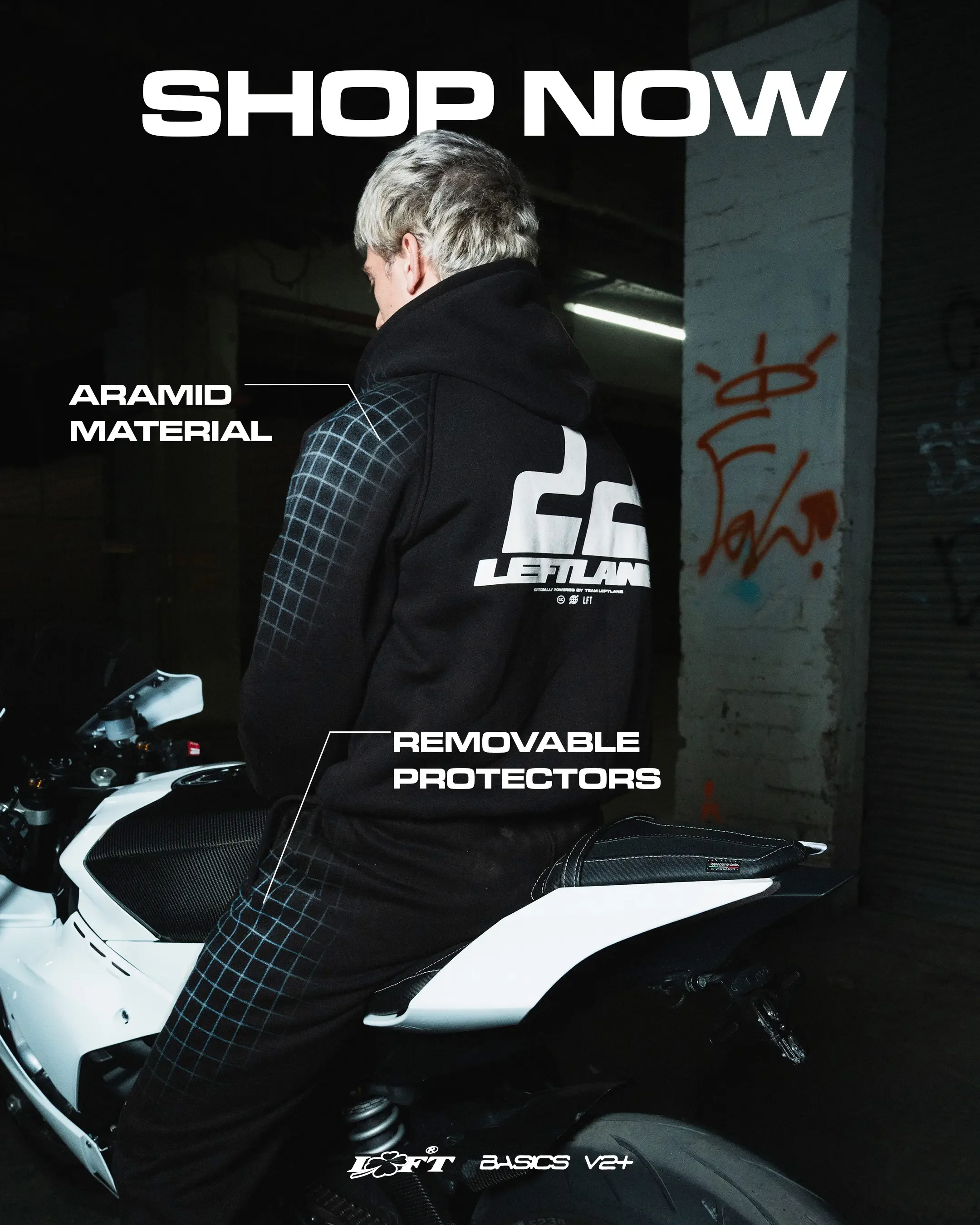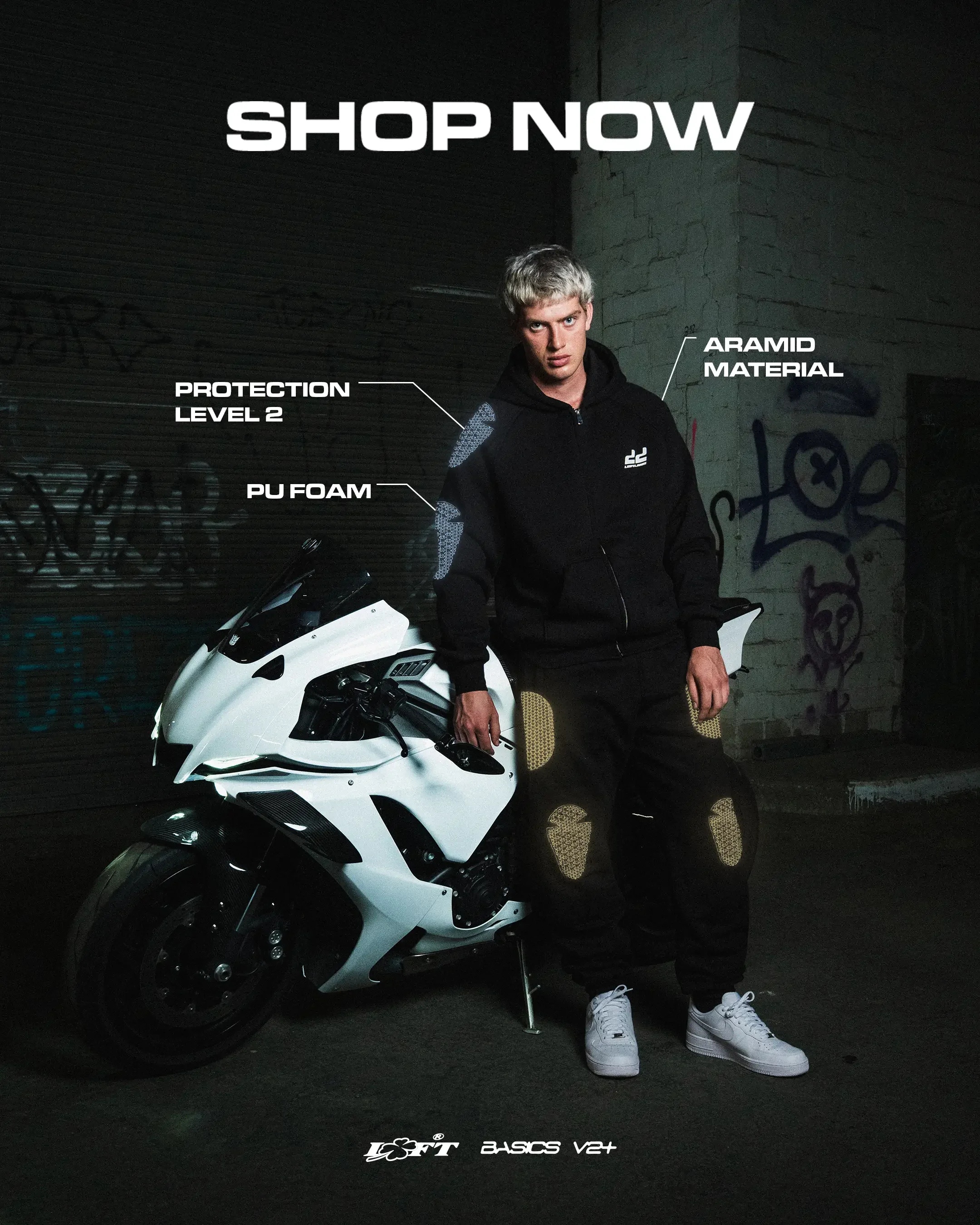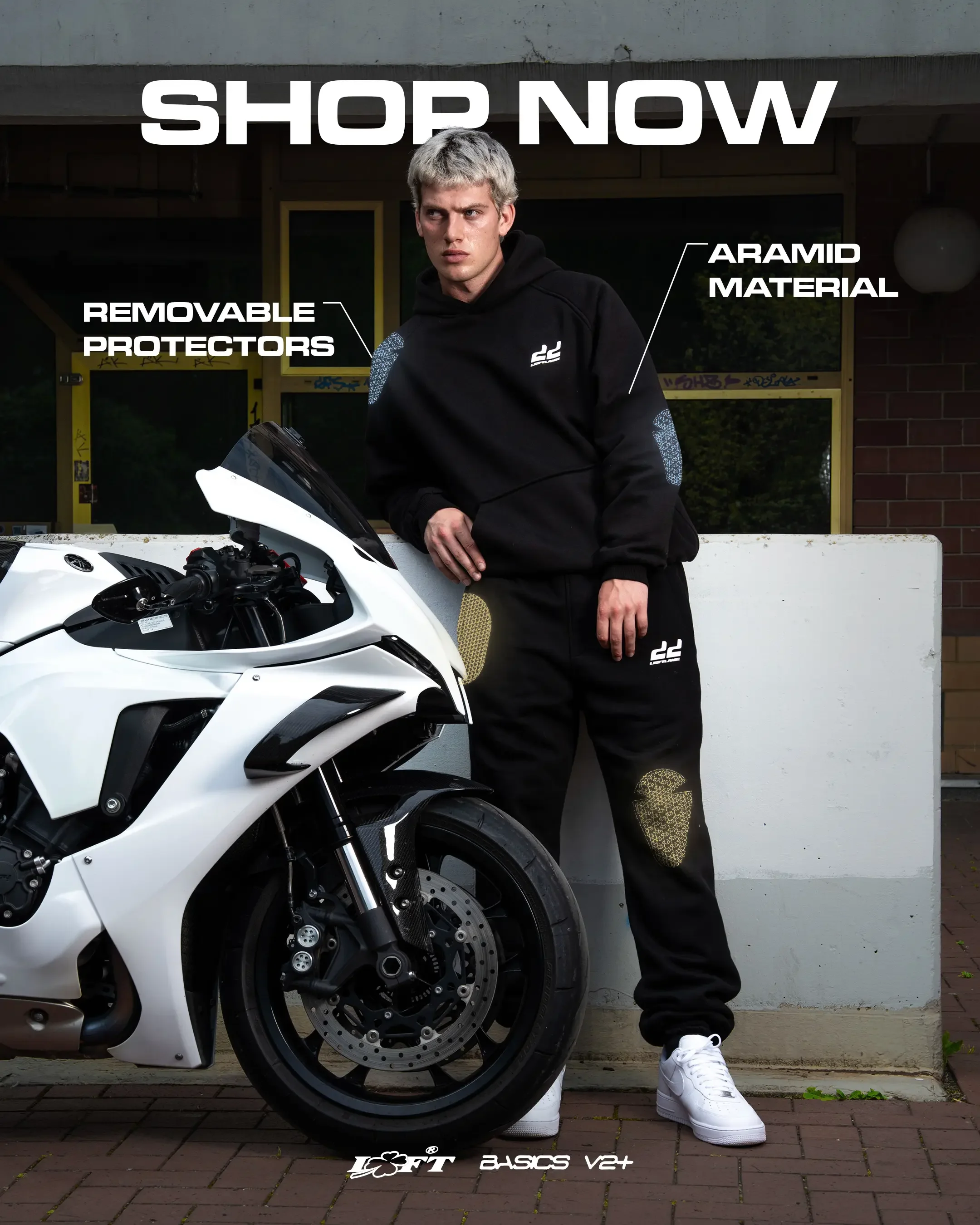 Person in black hoodie and sweatpants leaning on a white motorcycle, with labels indicating removable protectors and aramid material, and brand logos LOFT, BASICS, V2T at the bottom.