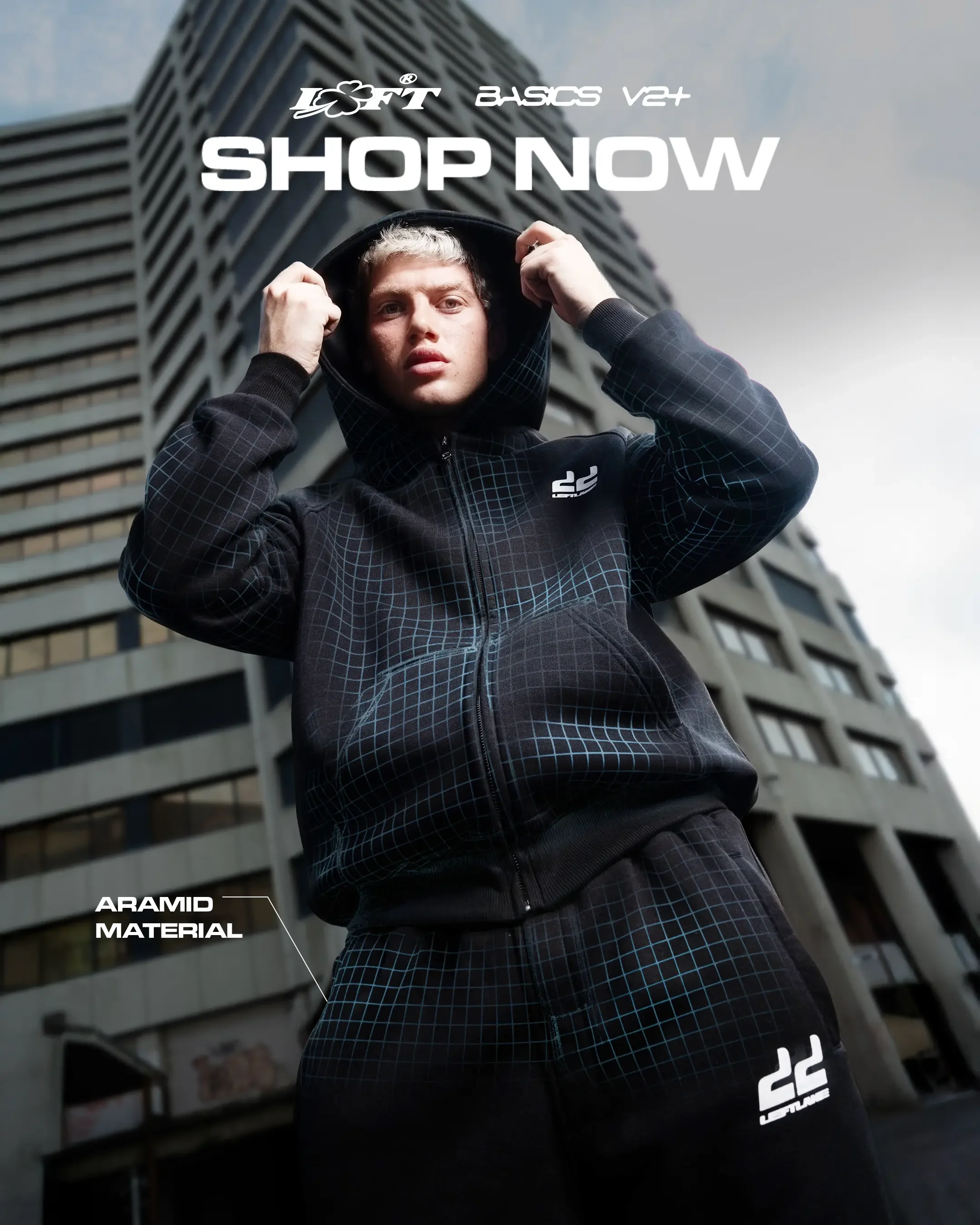 Young man wearing a black hoodie with a grid pattern, standing in front of a tall building, holding the hood with both hands, with text overlay advertising sportswear. View fullsize