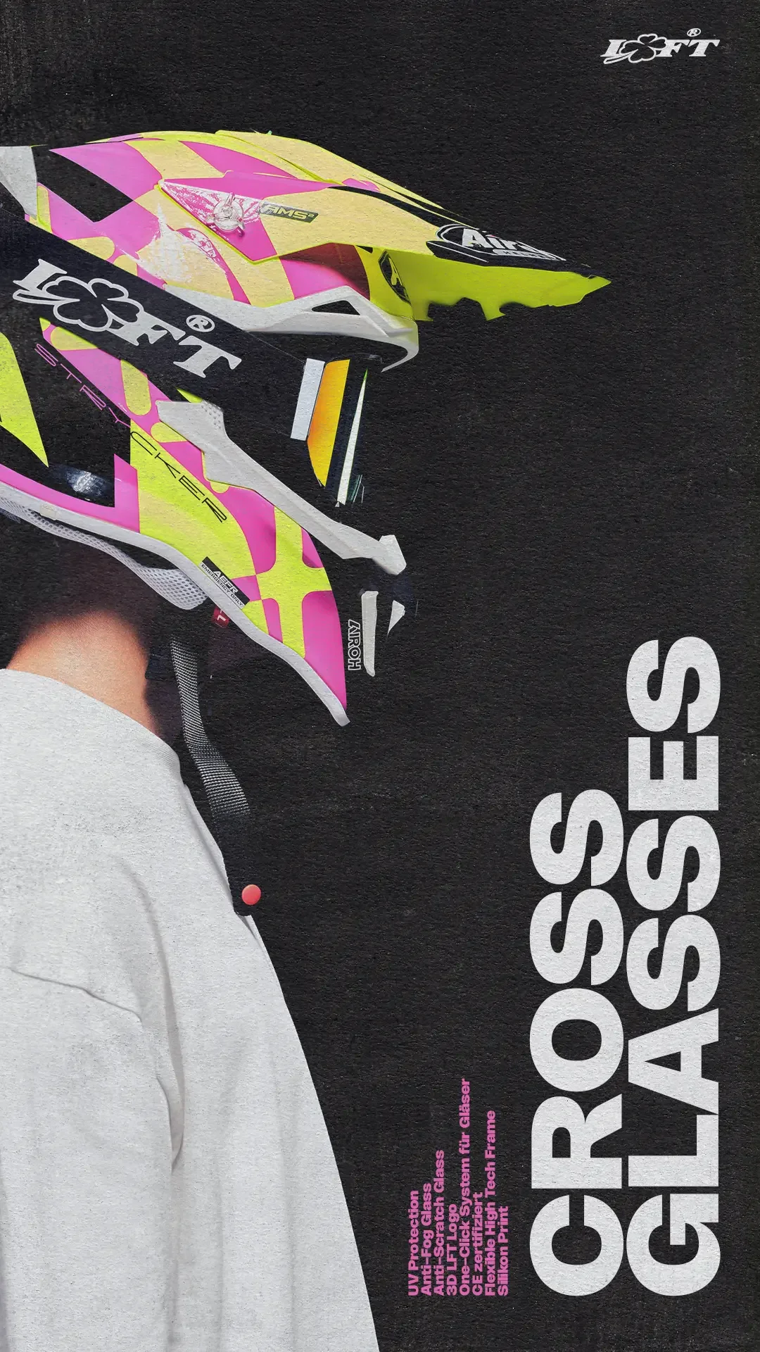 Close-up of a person wearing a white shirt and a pink and yellow motocross helmet, with large text indicating 'GOPOSS GASSES' and features list.