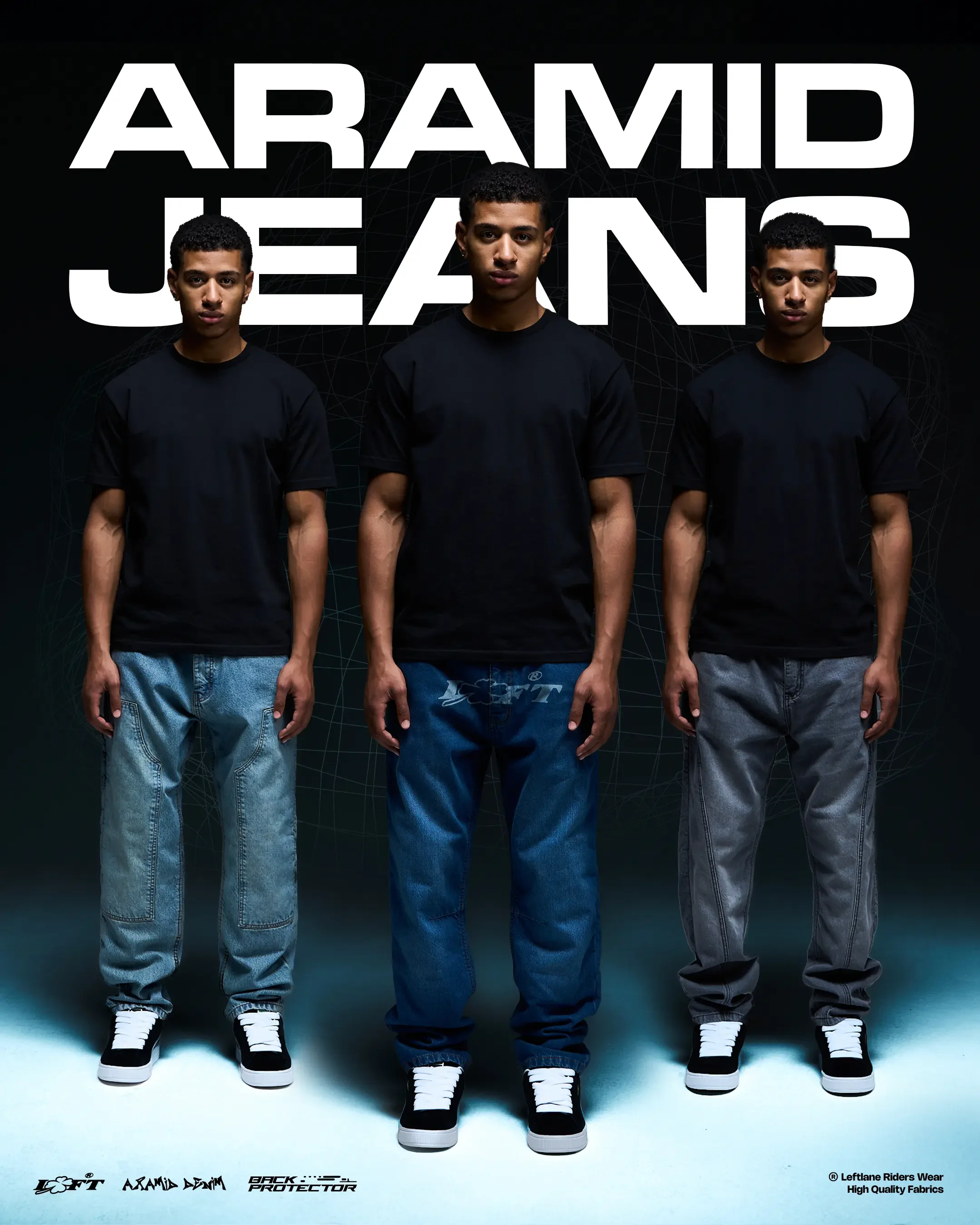 Three men wearing black t-shirts and jeans stand in front of a dark background with large white text that reads 'ARAMID JEANS'.