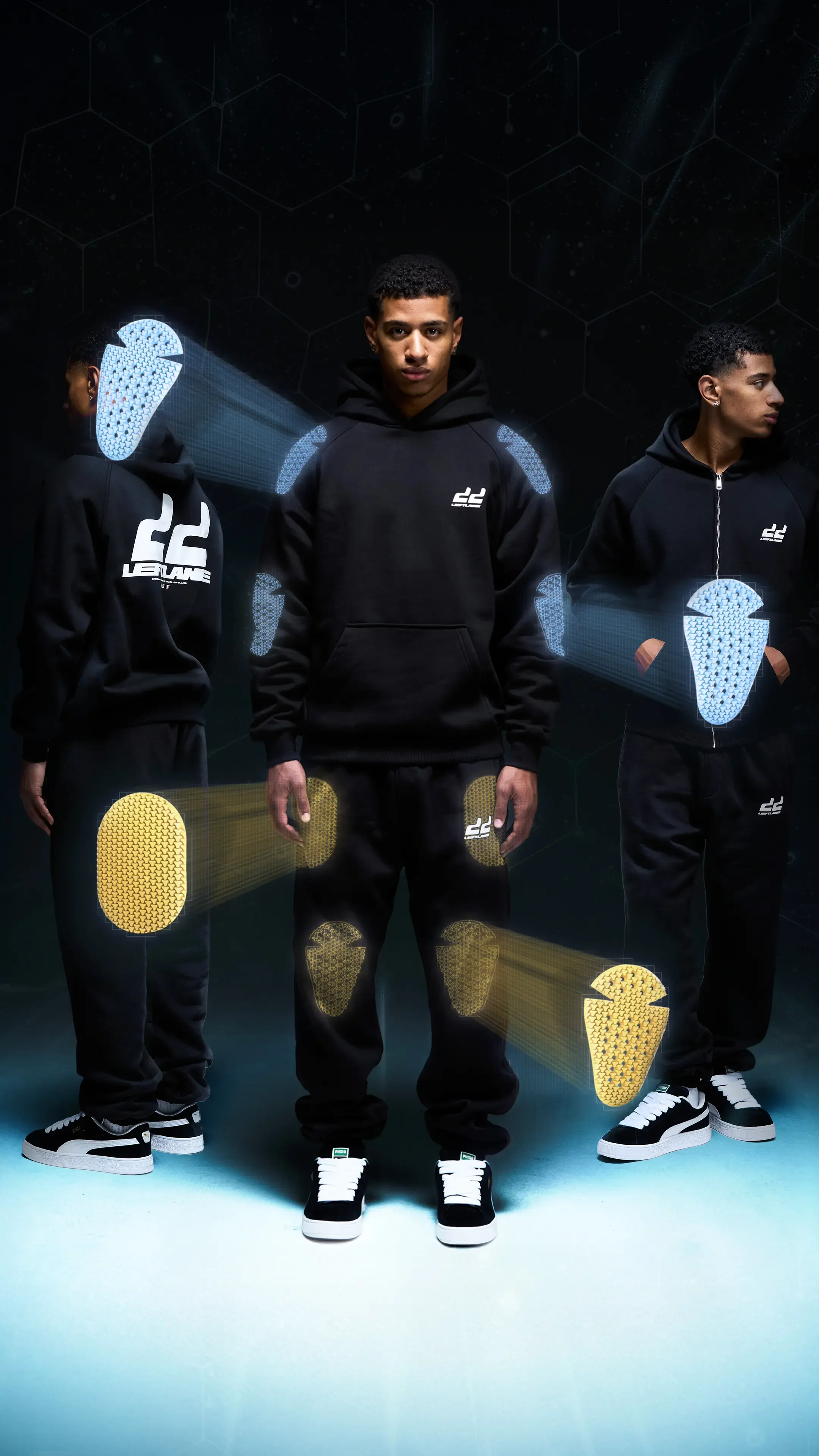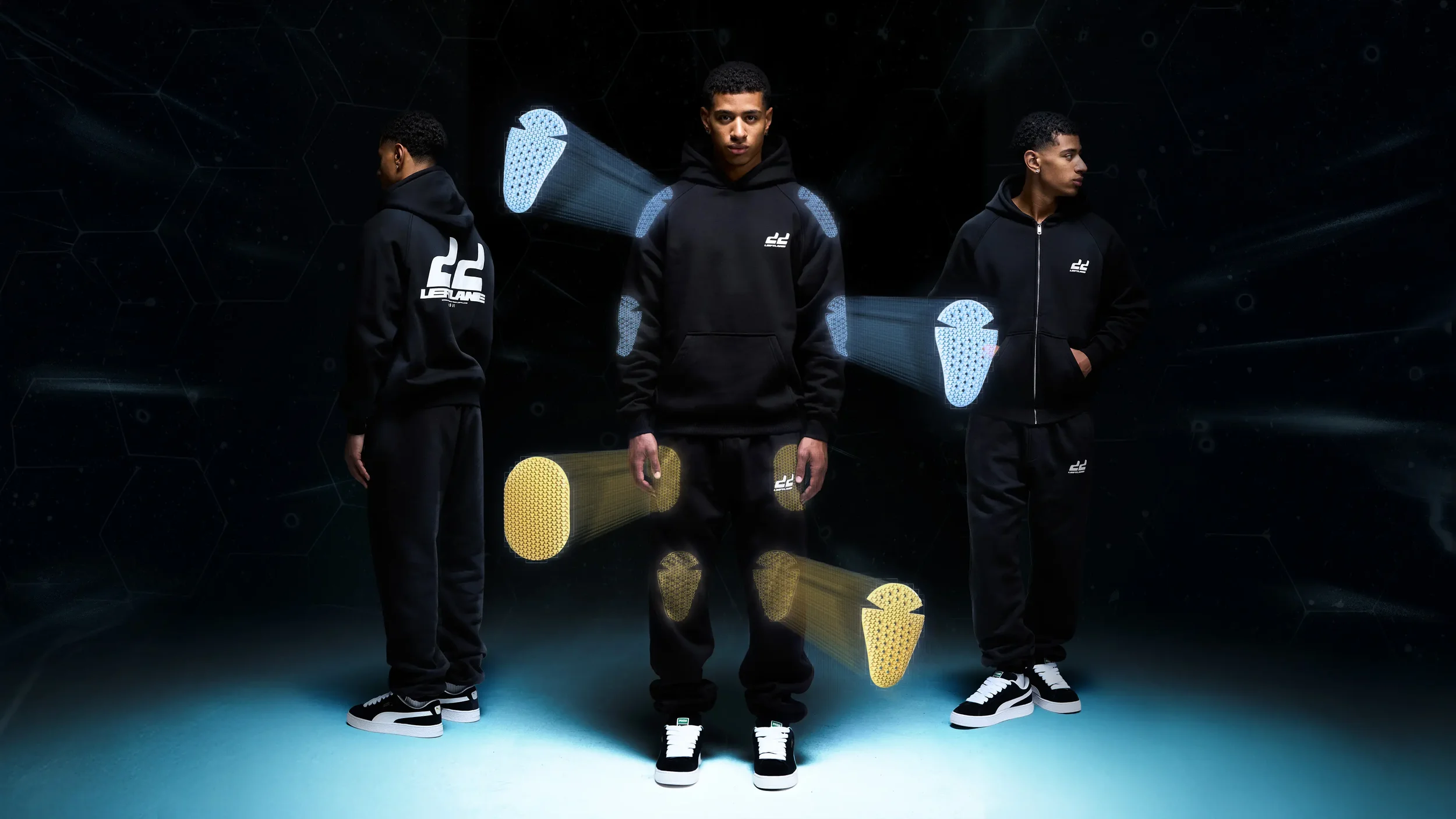 Three young men in black hoodies and sweatpants with 'LLAFANE' branding, standing against a digital, futuristic background with floating virtual sneaker sole designs and overlays, illustrating a virtual sneaker fitting concept. View fullsize