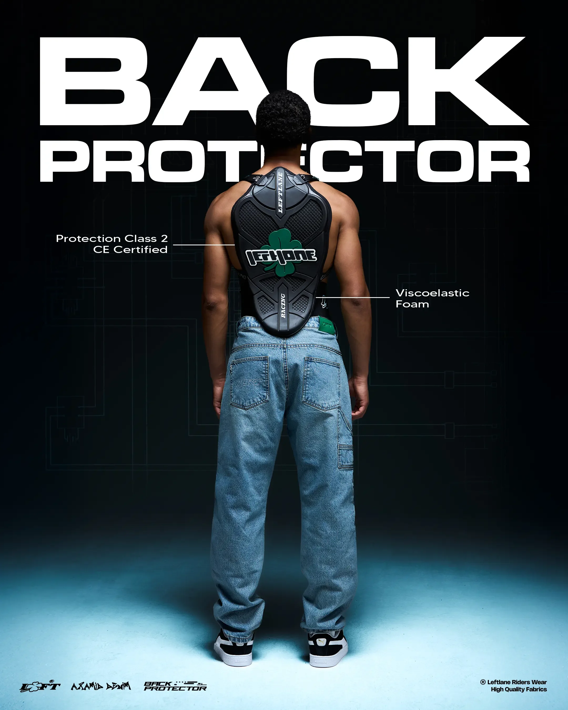 Back view of a person wearing a back protector with labeled features, standing against a dark background with large white text that says "BACK PROTECTOR."